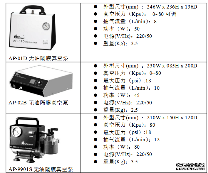 2.為了延伸電機(jī)的運用壽命,AP-01P/01D真空泵規(guī)劃有過熱維護(hù)功用。為了確保真空泵正常作業(yè),無油真空泵接連作業(yè)時間應(yīng)盡量少于30分鐘。如果泵體過熱無法正常作業(yè),封閉電源開關(guān),待電機(jī)溫度降低后,再從頭發(fā)動真空泵。