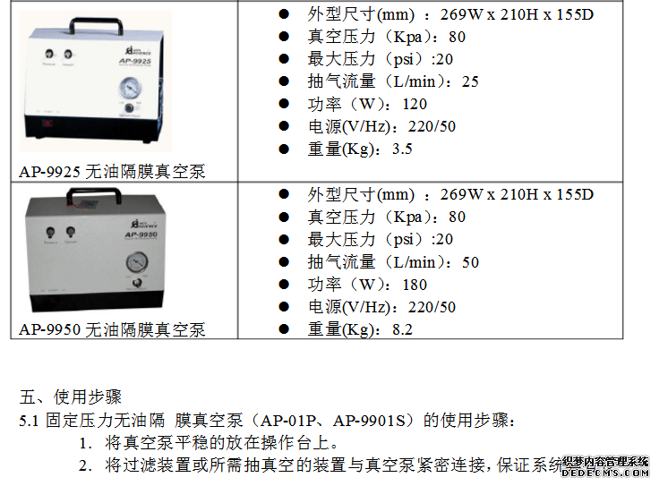 好的氣密性。可在真空泵的進(jìn)氣口和過濾器的出氣口外表涂上酒精等潤滑劑以便于銜接膠管。 5.2可調(diào)壓力無油隔閡真空泵(AP-01D、AP-02B、AP-9925、AP-9950)的運用過程: