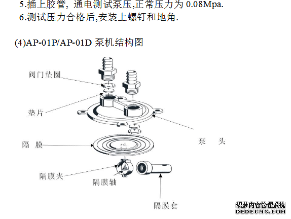 5.插上膠管,通電測驗電壓,正常壓力為0.08Mpa. 6.測驗壓力合格后,將螺釘涂上膠,固定上泵體底蓋.